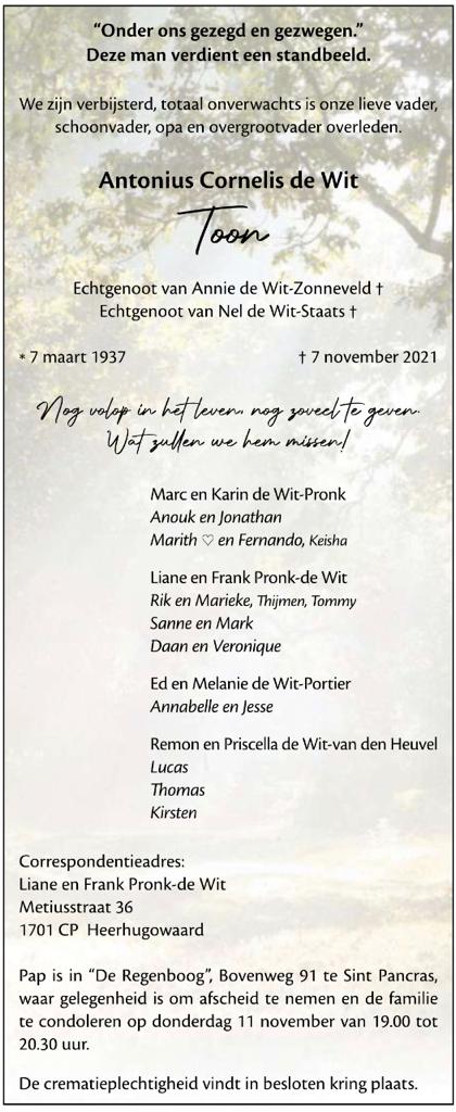 Bericht van overlijden Toon de Wit